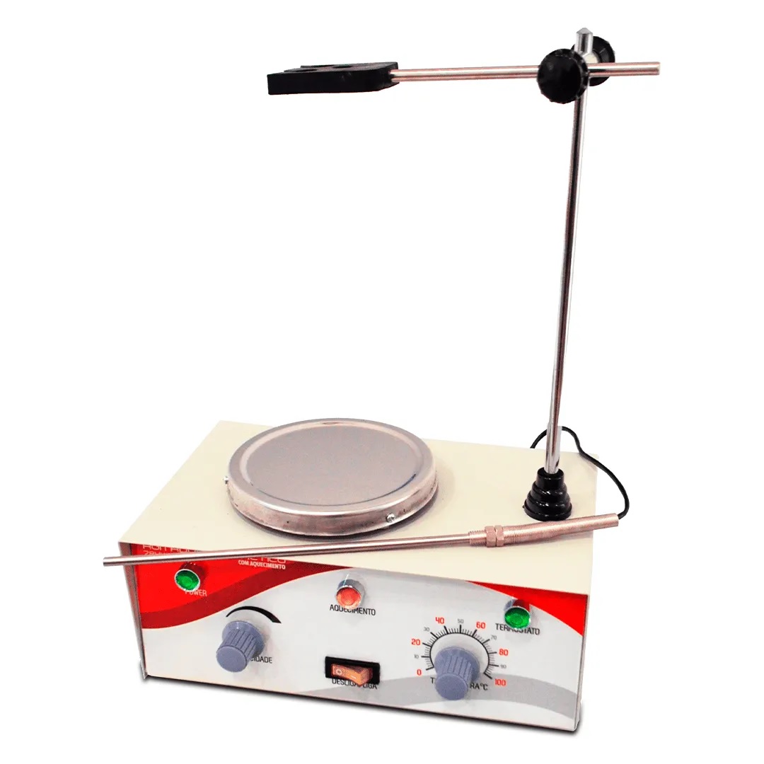 Agitador magnético com aquecimento, para agitação de (aproximadamente) até 2 litros de soluções com viscosidade próxima a da água, com as seguintes características: